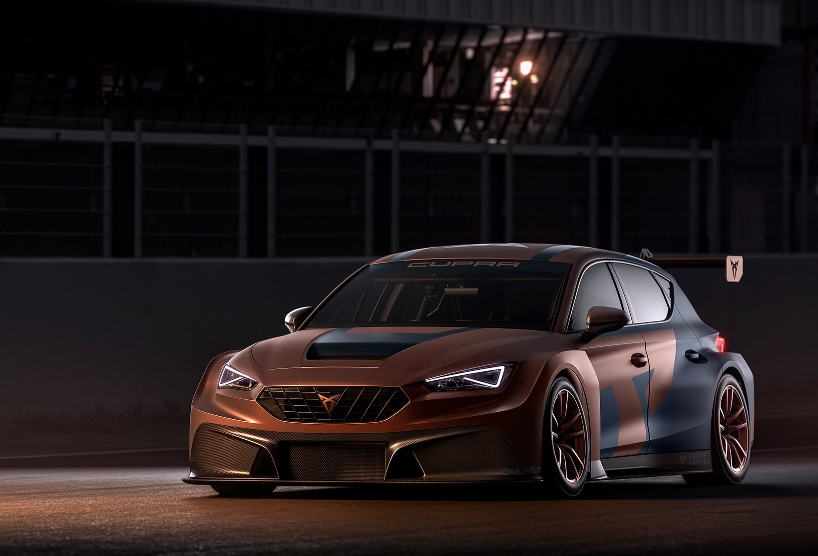 Une CUPRA Leon à hayon vue d’un angle surélevé avec ses phares allumés, à côté d’une personne recouverte d’un tissu sombre et fluide qui tapisse sur le sol.